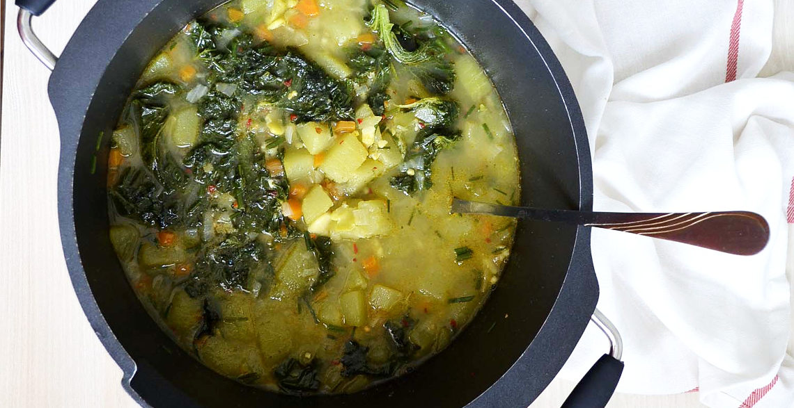 Pet minuta pred kraj dodati seckani (krupnije) lisnati kelj i sitno seckani vlašac, po potrebi još malo začiniti i poslužiti.