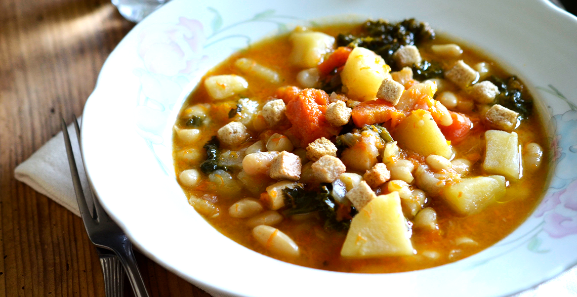 Krompir i tikvu iseckati na malo krupnije kockice, lisnati kelj očistiti od peteljke i debljeg dela po sredini, da ostanu samo listići.