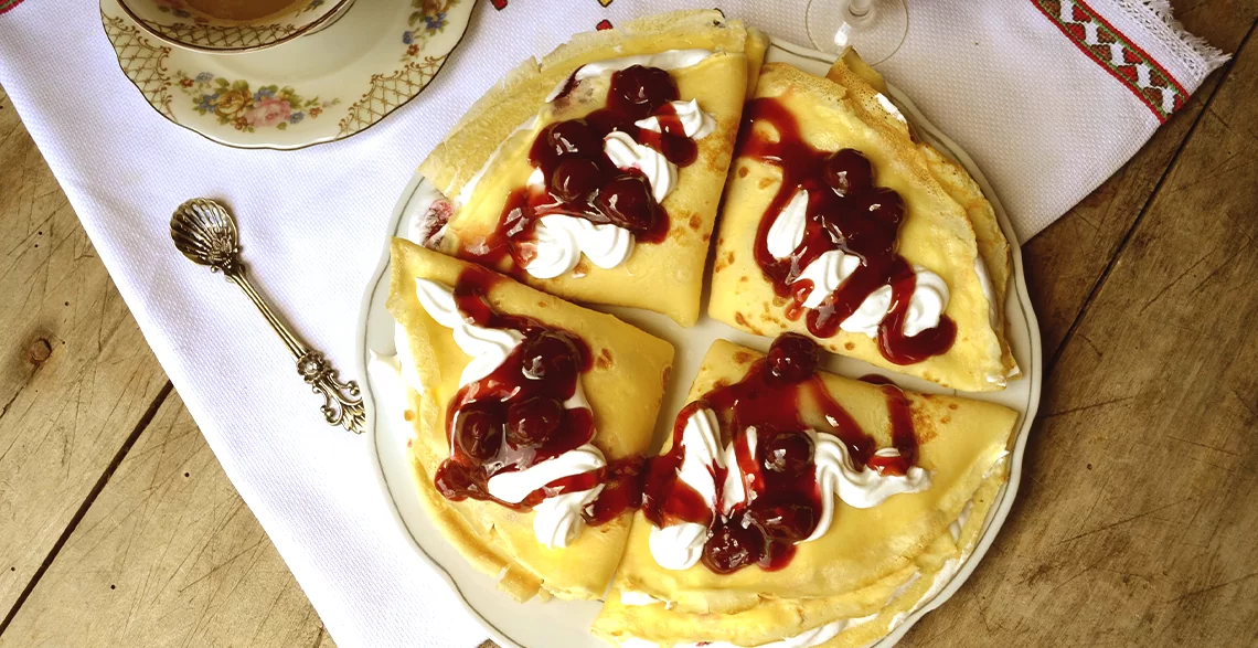 Filovati palačinke umućenim šlagom i sosom od višanja. Preklopiti i ukrasiti „kupovnim“ prelivom od višanja, po želji.