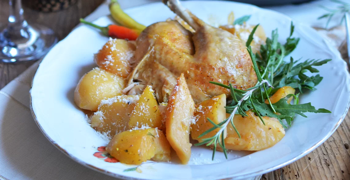Po isteku vremena pažljivo ispustiti pritisak iz lonca, otvoriti ovaj kuhinjski aparat i prebaciti pile i krompir u posudu koja može da ide u rernu. Po ukusu, posuti mešavinom suvog začina. Zapeći sve 10ak minuta u rerni predhodno zagrejanoj na 250C. Piletina i krompir će na taj način biti rumeniji i dobiti koricu.