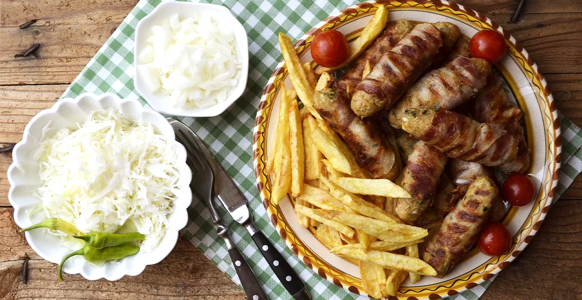 Od pripremljene smese oblikovati ćevape (povremeno ruke nauljiti radi lakšeg rukovanja) i svaki ćevap umotati režnjem slanine.