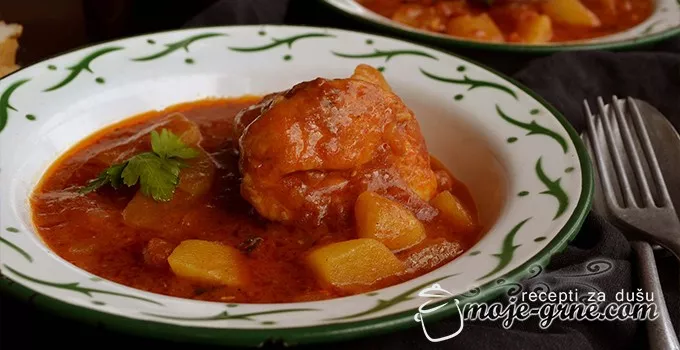 U kaserolu zatim staviti seckani paradajz sa sokom, kao i krompir iseckan na manje kockice.