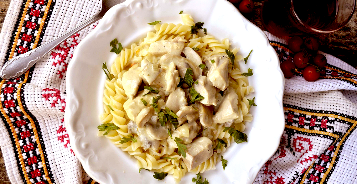 Pred kraj kuvanja dodati iseckane marinirane šampinjone, krčkati još par minuta, pa skloniti sa vatre. Poslužiti uz testeninu i posuti peršunom.