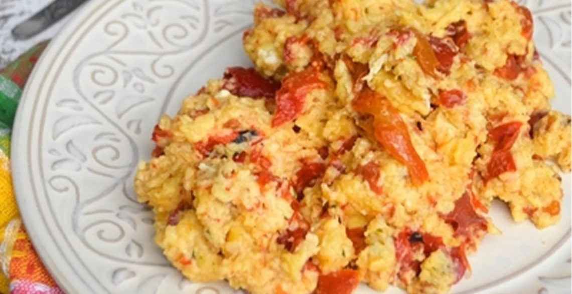 • Tiganj zagrejati, dodati papriku, preliti umućenom mešavinom i pržiti uz stalno mešanje dok se svi sastojci lepo ne sjedine i povežu. Poslužiti toplo.