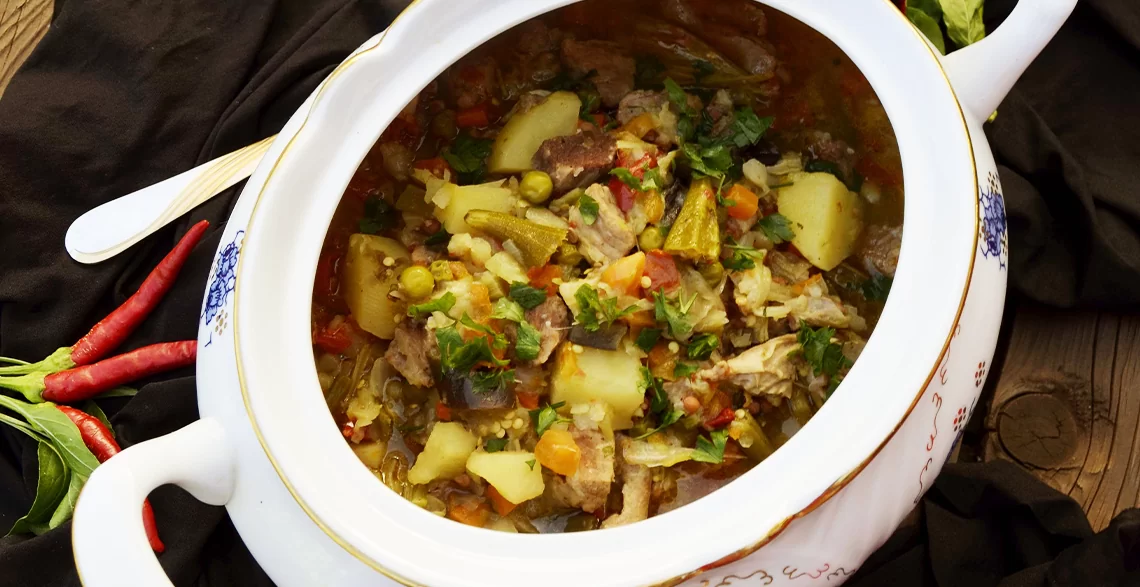 Izdinstano meso izvaditi iz lonca, pa ređati u lonac naizmenično povrće i meso (podeliti sve na nekoliko delova).