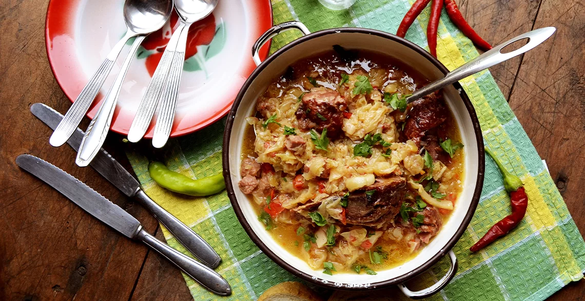 Preko rasporediti polovinu seckanog kupusa, staviti začine, pa rasporediti rebra, isečena na manje komade, zatim staviti ostatak kupusa, naliti vrelom vodom, poklopiti lonac i ostaviti da se kuva do isteka vremena.