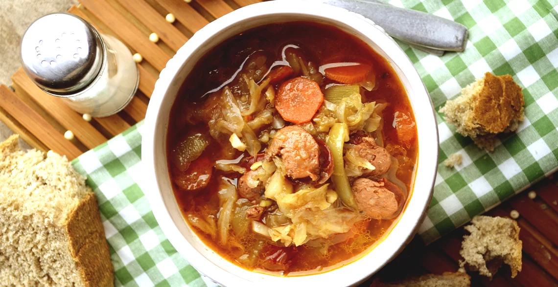 • Poklopiti pa kuvati nekih 30 minuta, a zatim dodati na kolutove isečenu kobasicu i nastaviti sa kuvanjem još 20 minuta.