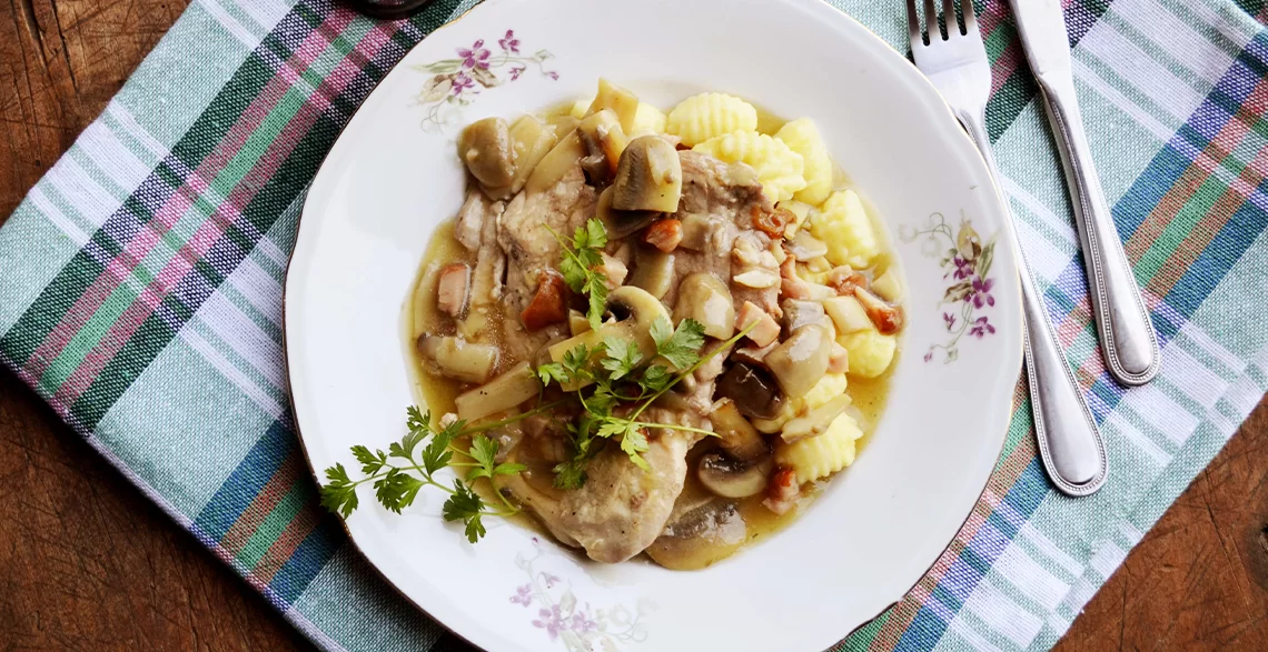 Dodati supu i vratiti šnicle u kaserolu, pa kuvati dok meso i šampinjoni ne omekšaju (povremeno šnicle okretati) i ne ispari višak tečnosti.