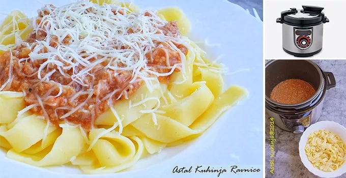 Luk i mleveno meso par minuta prodinstati u tiganju, pa sve prebaciti u električni ekspres lonac Lupo Marshall. Dodati oko 1dl vode, posoliti i pobiberiti. Možete odmah staviti i origano.